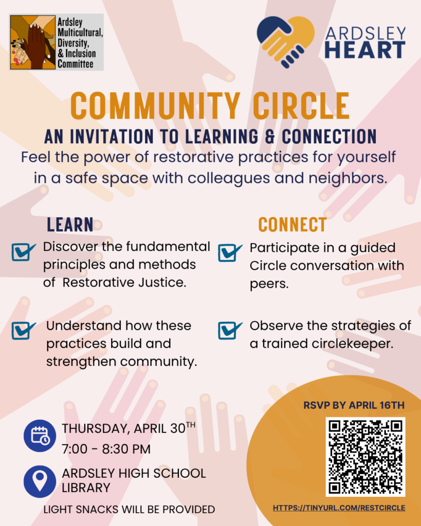 You are the heartbeat of the Ardsley community! Join fellow teachers, staff, and parents for a special evening of connection guided by the principles of Restorative Practices.