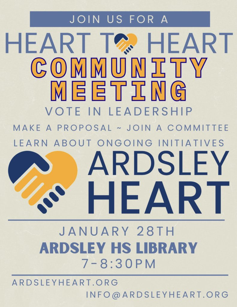 We will be having our first Ardsley HEART General Meeting ❤️2❤️ on January 28th, 2026 at Ardsley High School Library from 7-8:30p.